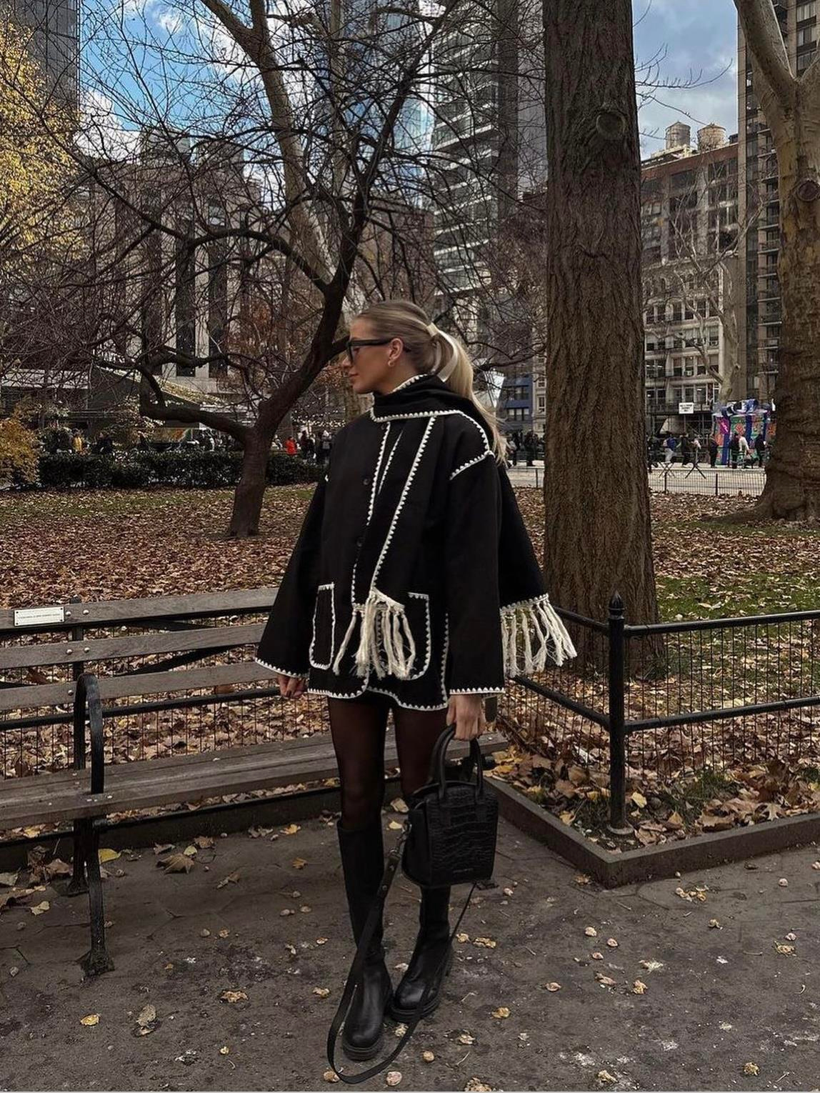 Nakışlı atkı detaylı siyah beyaz kaban.
