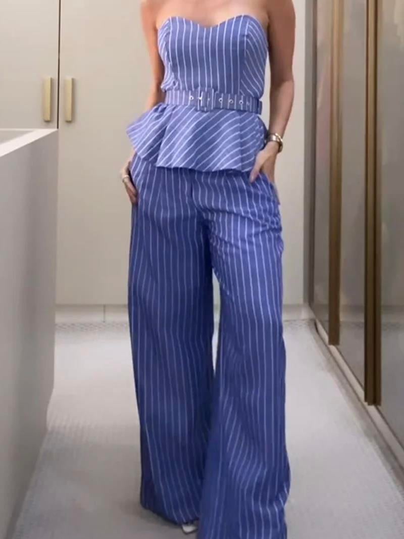 Çizgili palazzo pantolon ve straplez üst takım.