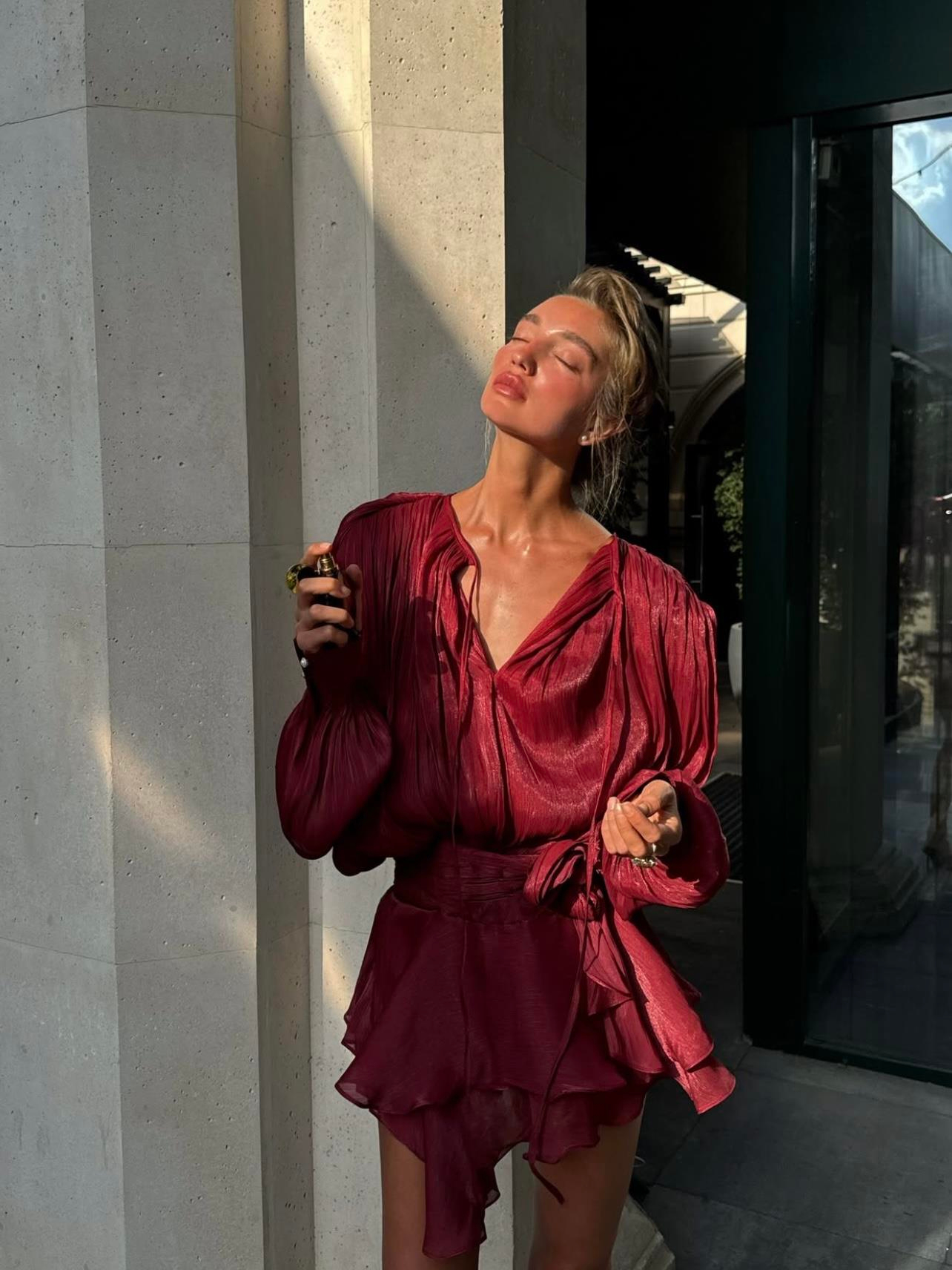 SATEN GÖRÜNÜMLÜ PLİSELİ BORDO MİNİ ELBİSE