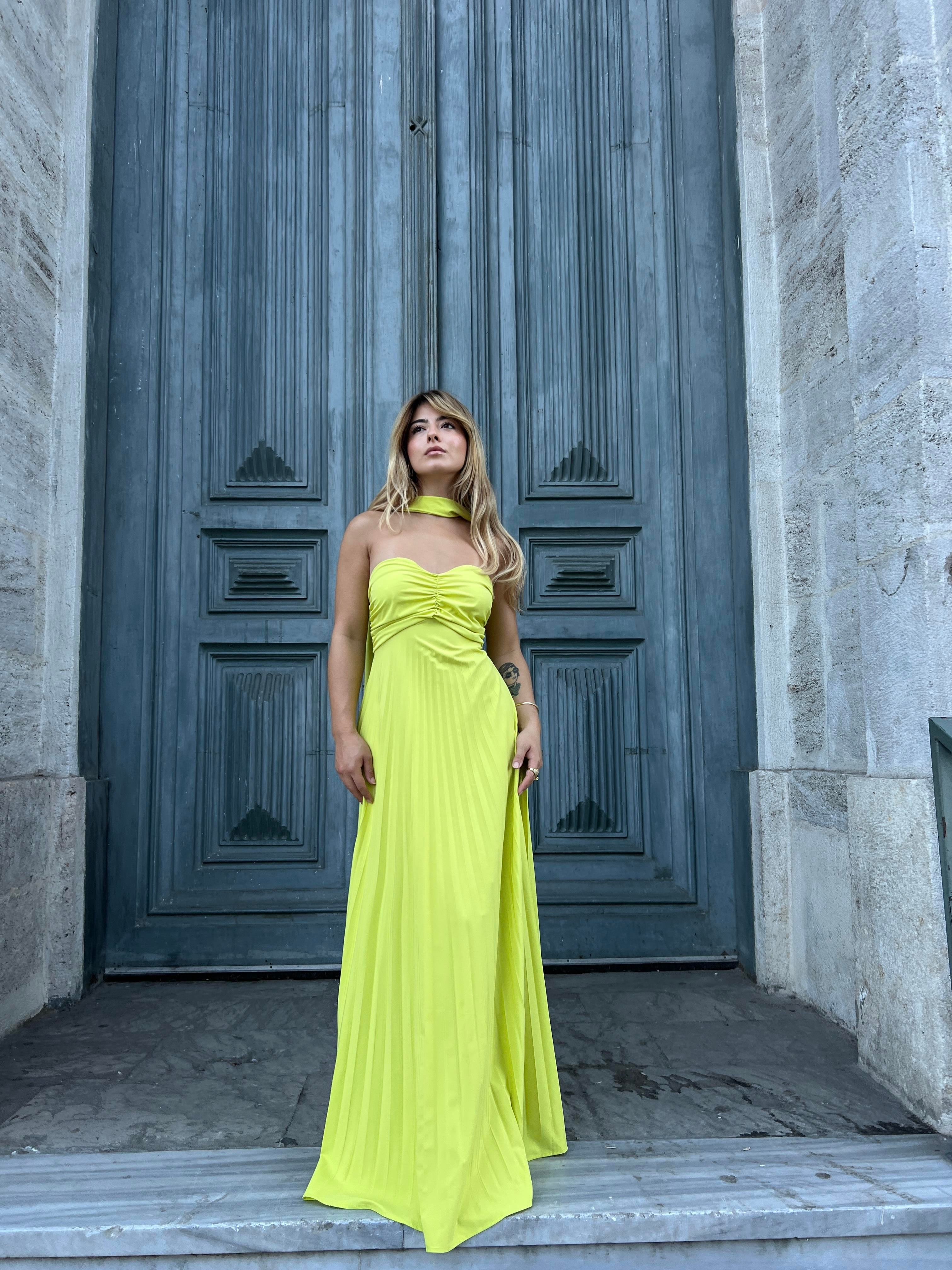 LIME YEŞİLİ BOYUN DETAYLI STRAPLEZ UZUN ELBİSE